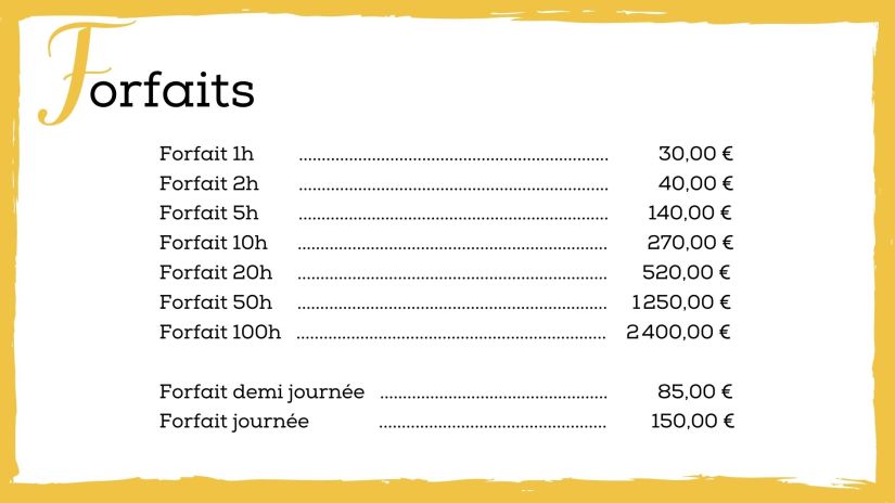 Vous trouverez ci-dessous les différents tarifs et prestations que je propose. La liste de mes compétences n’est pas exhaustive, n’hésitez donc pas à me contacter pour discuter de vos attentes.