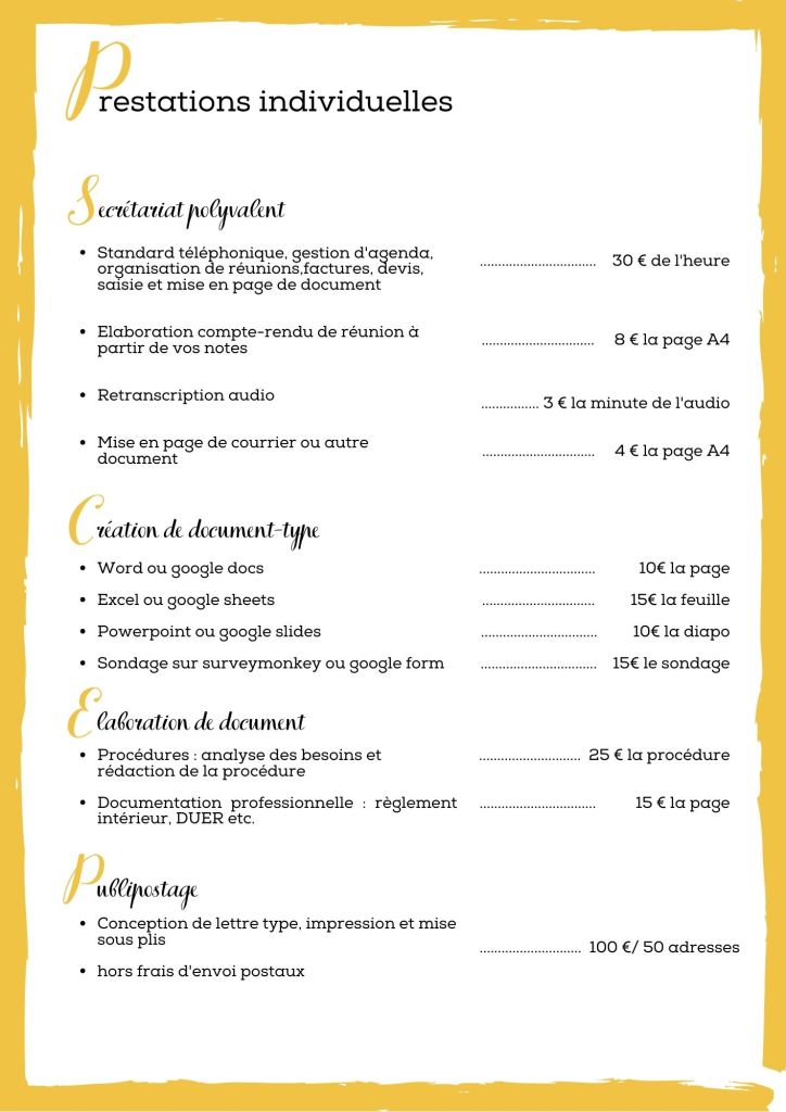 Profitez de mon expertise pour des missions de secrétariat telles que l’accueil téléphonique, la gestion d’agenda, l’organisation de réunions, la saisie et la mise en page de documents ou encore l’élaboration de factures et de devis. Je propose une tarification horaire qui s’adapte spécifiquement à vos besoins.